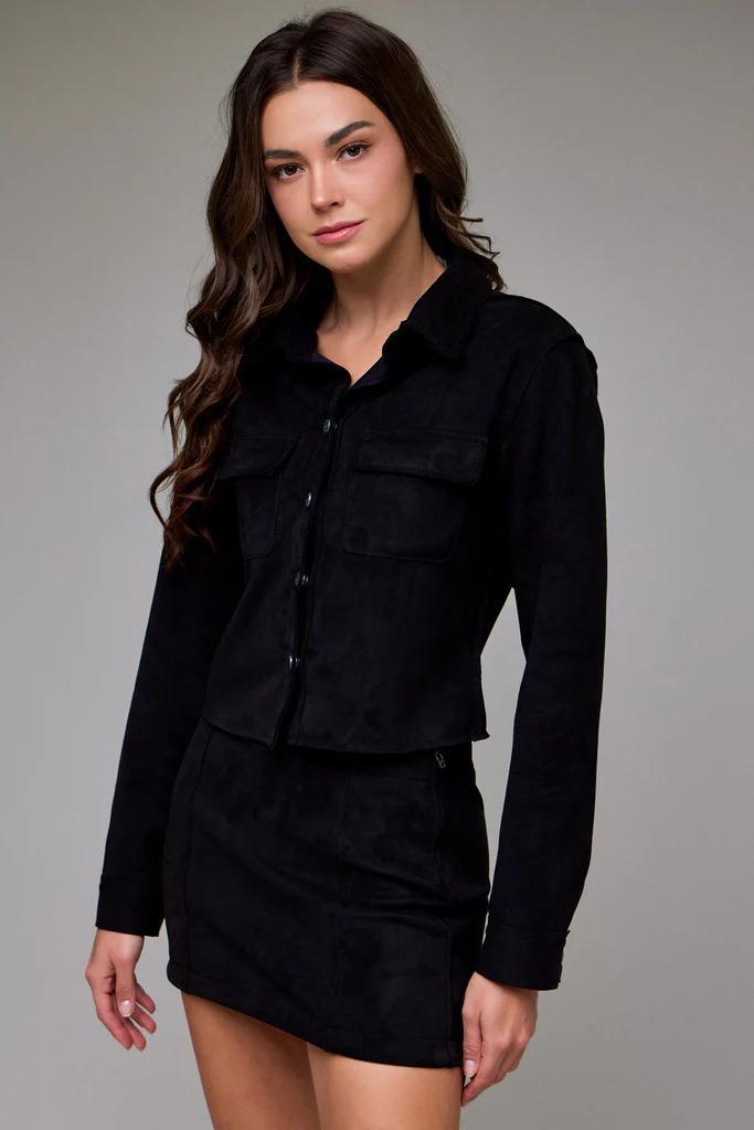 Soft, cropped, and just structured enough, this faux suede shirt has a rich, velvety texture that instantly adds depth to your outfit. The fit is intentionally shrunken with a slightly boxy cut, hitting just at the waist for a modern, flattering silhouette. It’s lightweight but elevated, making it a great year-round layer.